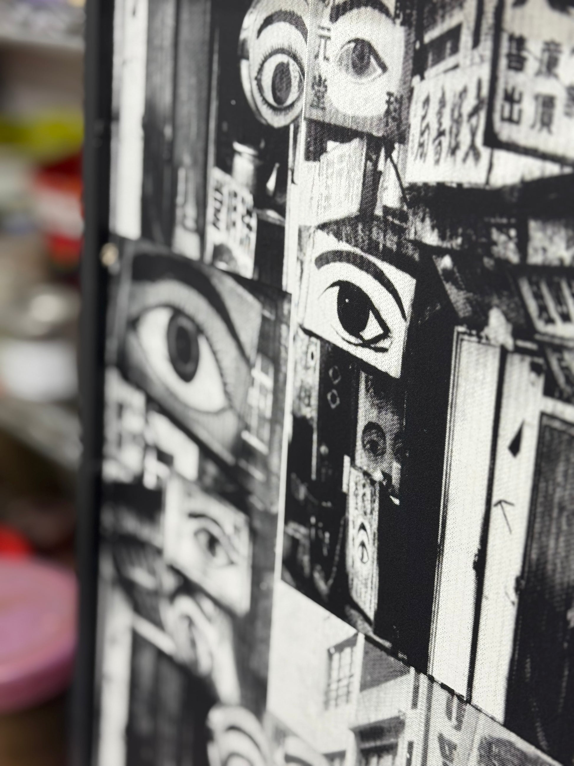 写真家・朱逸文(しゅ いつぶん)が撮影し、『フォトアート』1963年5月号に掲載された伝説的な写真作品「目」。その印象的なビジュアルを、全面シルクスクリーンの手法でプリントしたポスター作品です。