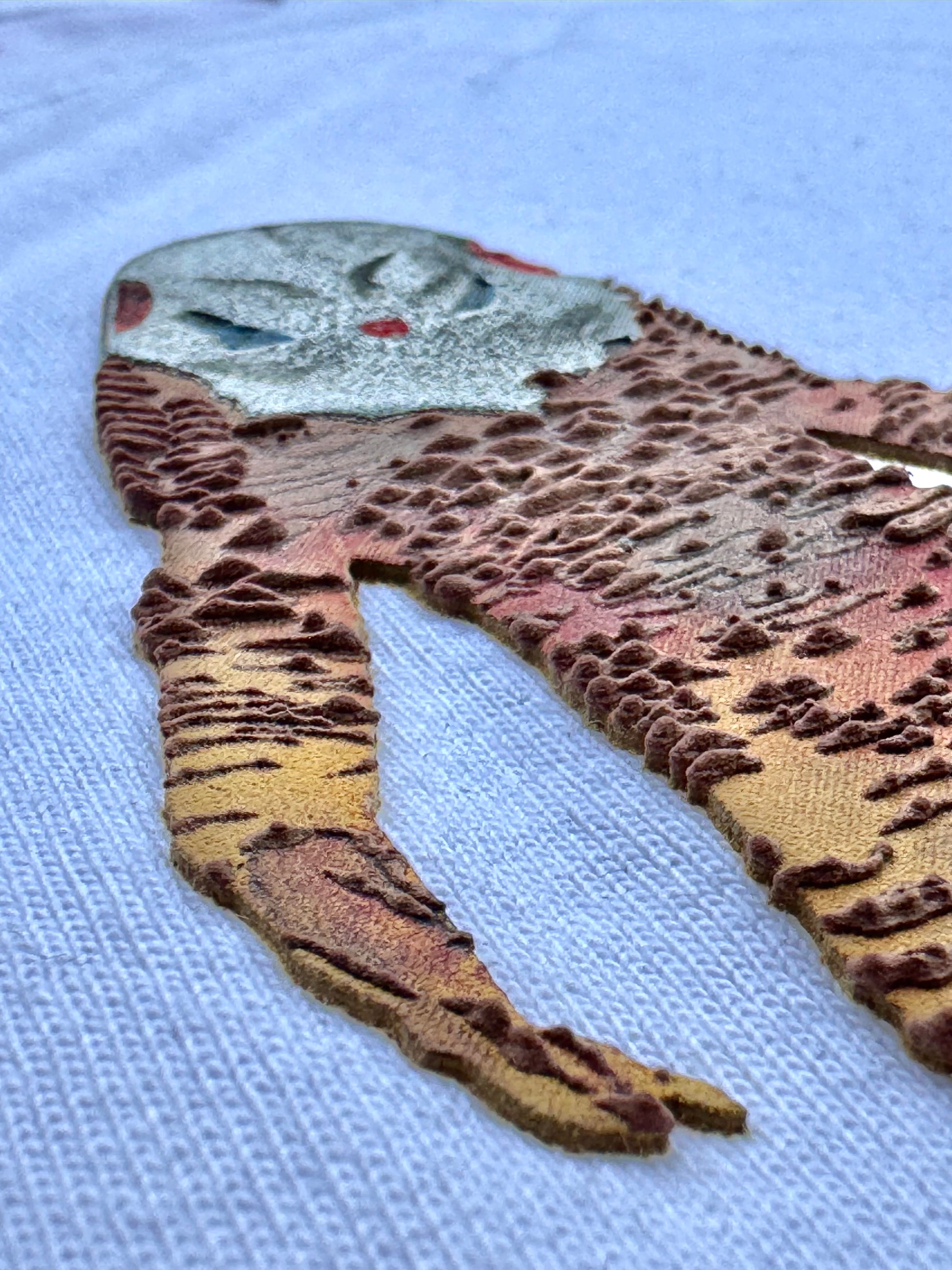 怪獣のもつ重量感、皮膚や表皮のディテール、”立体であること”そのものの魅力を、7TH WORLD独自の3Dシルクスクリーン技法によって表現。キャラクターを「描く」のではなく、Tシャツの上に存在させるアプローチで再構築しています。